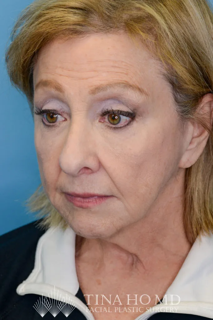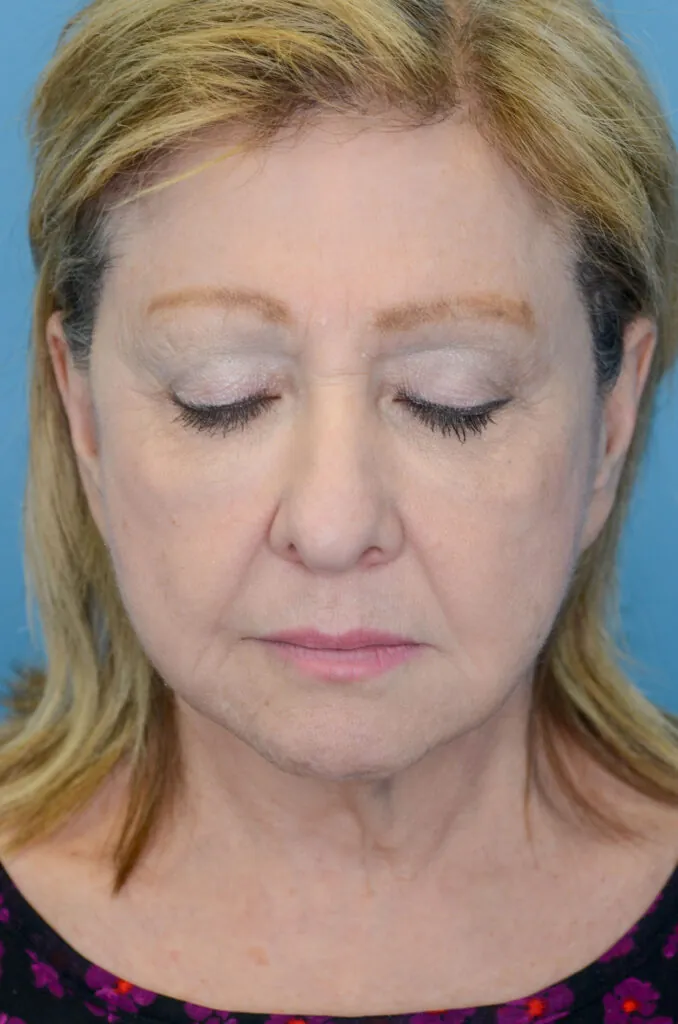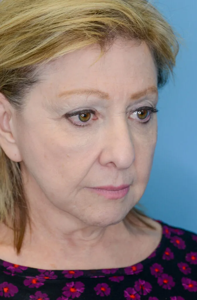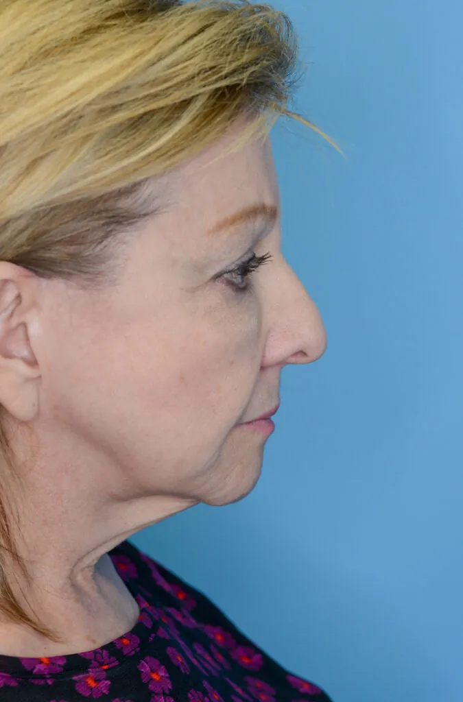 64 year-old female with prior history of brow lift, facelift, and neck lift who underwent brow lift and upper blepharoplasty for brow and eyelid rejuvenation as well as closed rhinoplasty to lift the nasal tip.