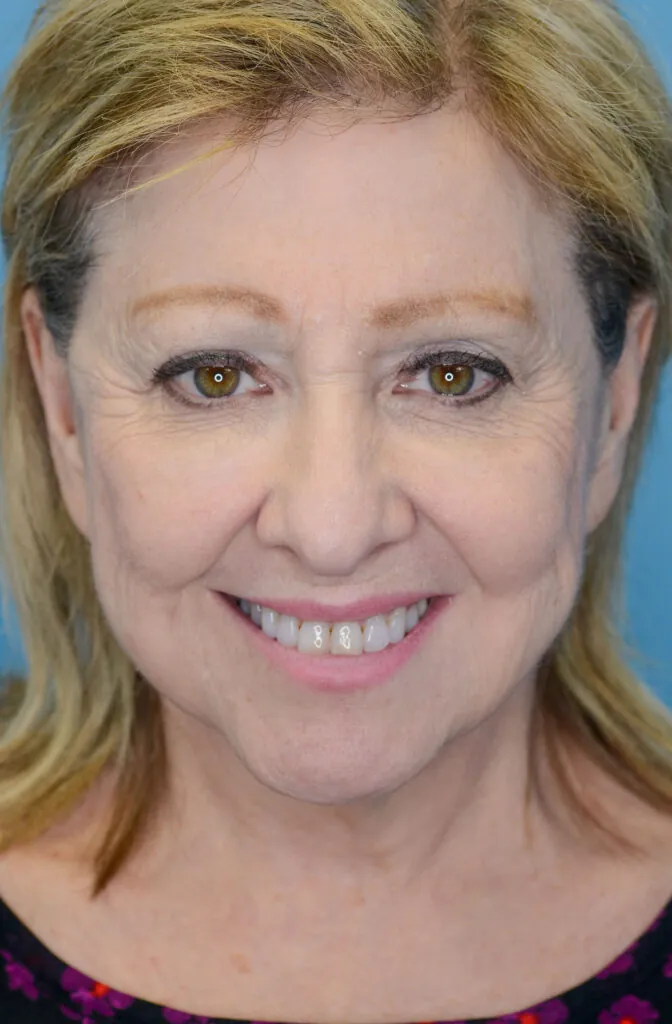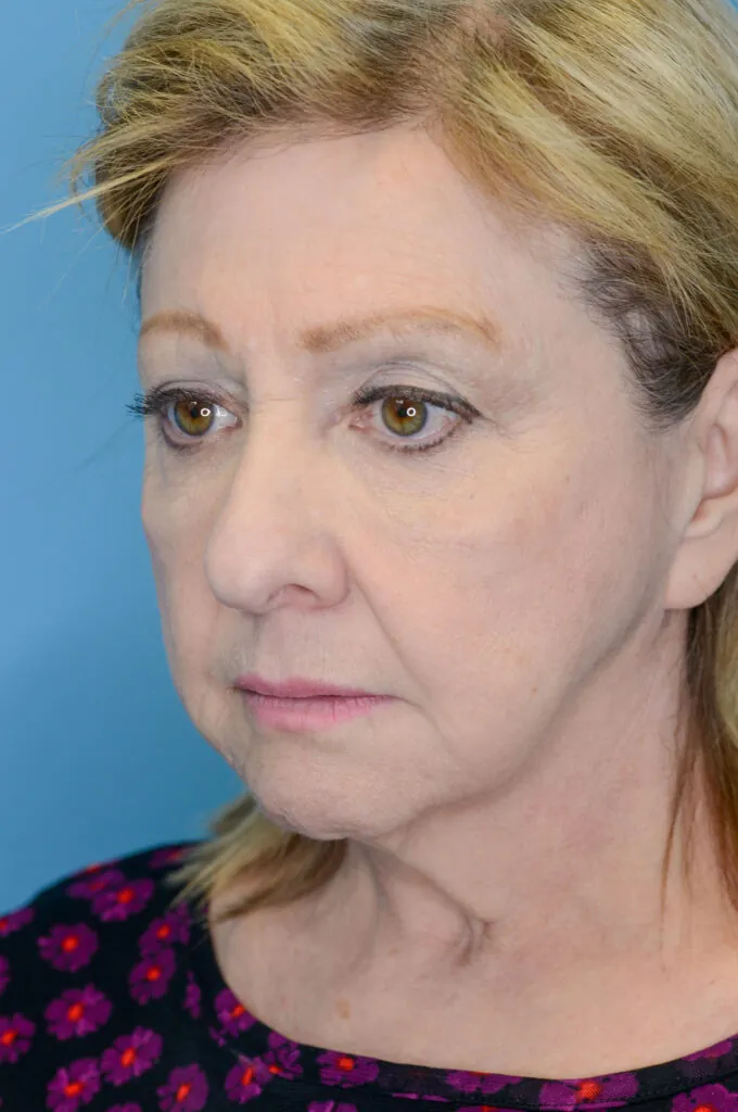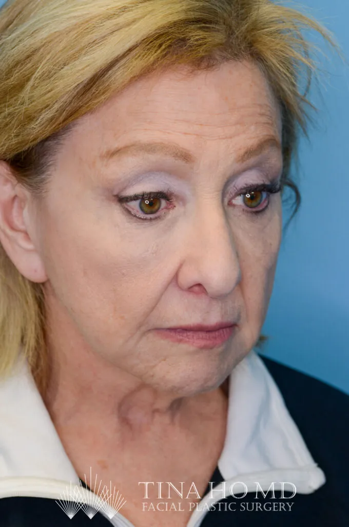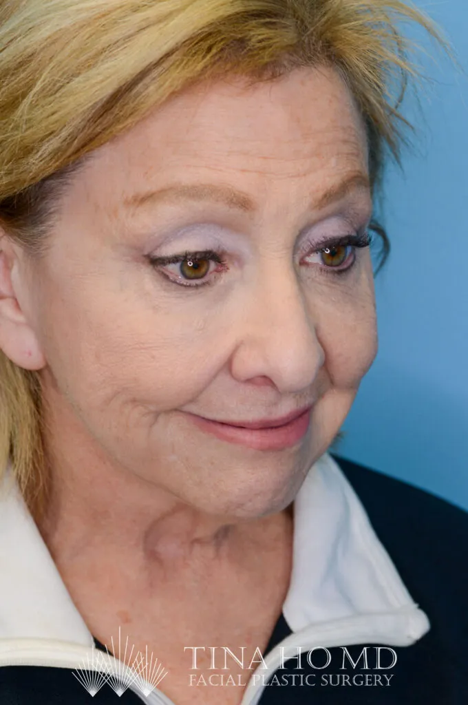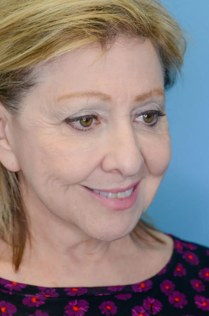 64 year-old female with prior history of brow lift, facelift, and neck lift who underwent brow lift and upper blepharoplasty for brow and eyelid rejuvenation as well as closed rhinoplasty to lift the nasal tip.