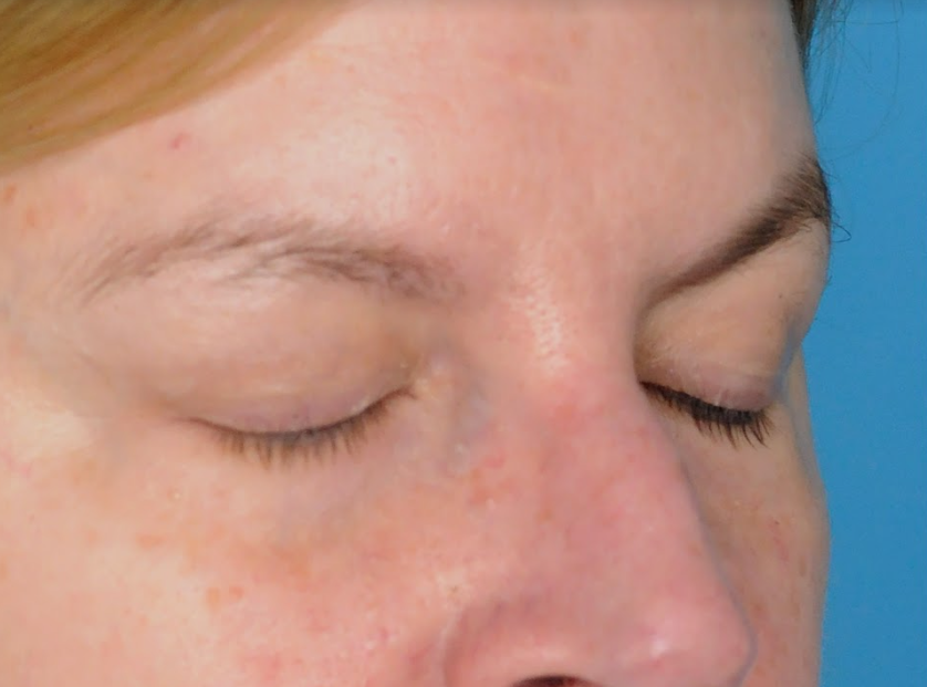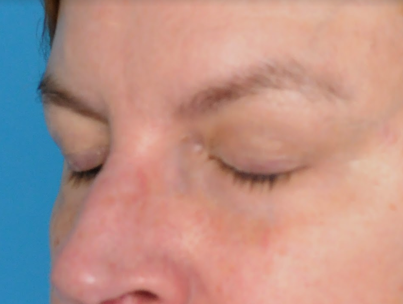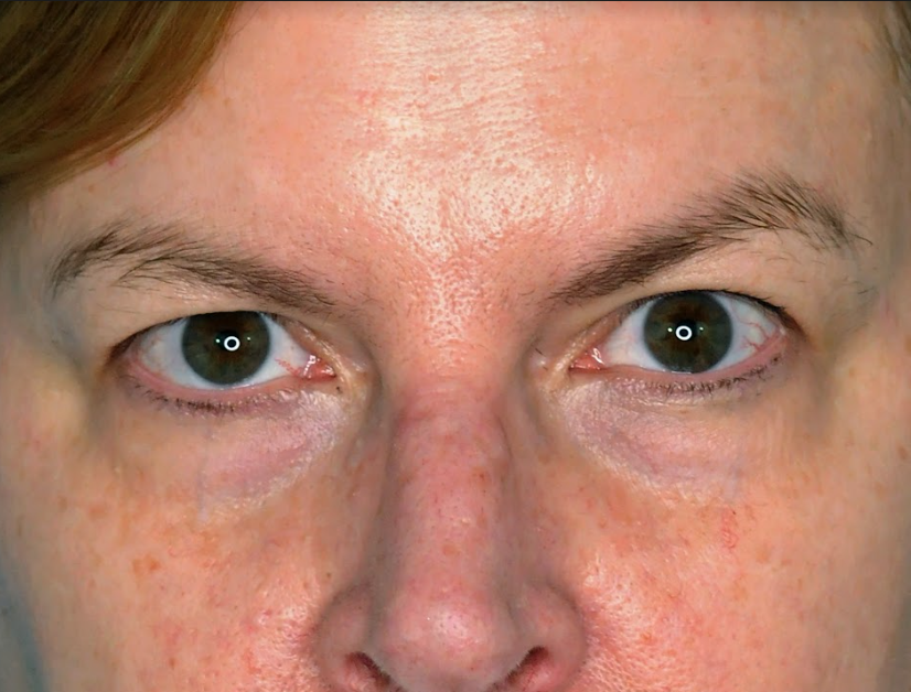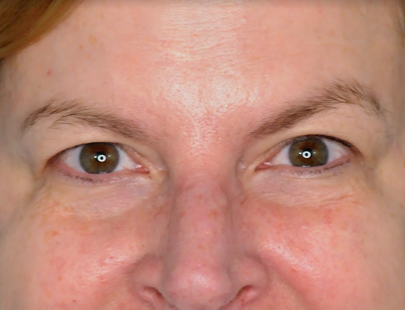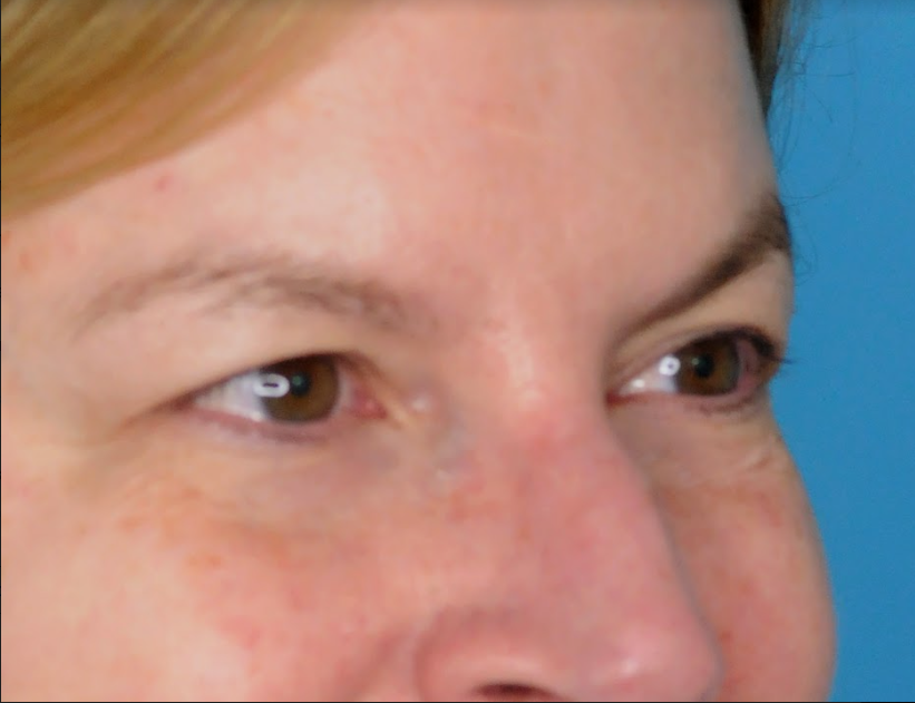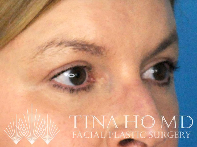 38 year-old female who underwent brow lift, upper eyelid surgery lower eyelid surgery, facial fat transfer, and CO2 laser resurfacing for eyelid rejuvenation