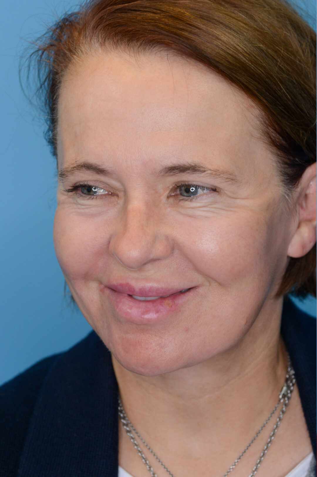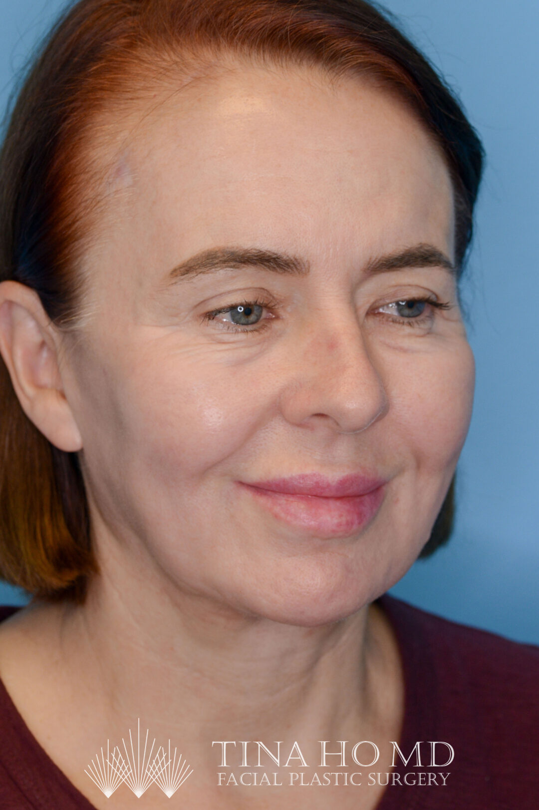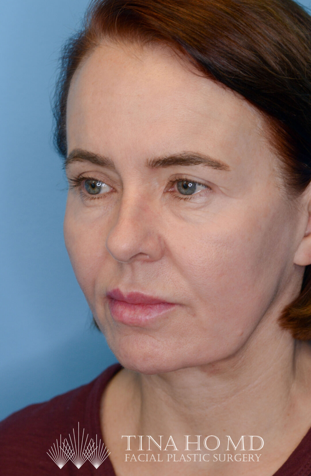 54 year-old female who underwent brow lift and lower blepharoplasty with facial fat transfer and CO2 laser resurfacing for brow and eyelid rejuvenation.