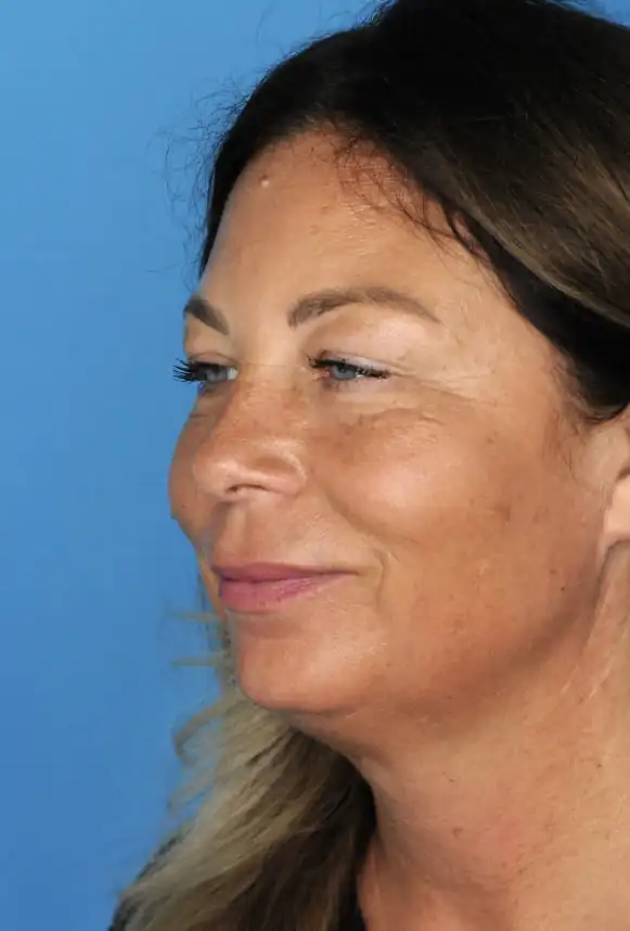 45 year-old female who underwent upper eyelid surgery, facelift, facial fat transfer, and chin augmentation for facial rejuvenation and facial contouring