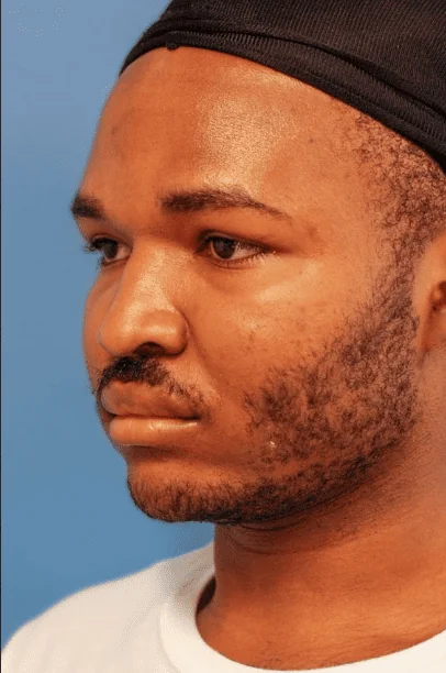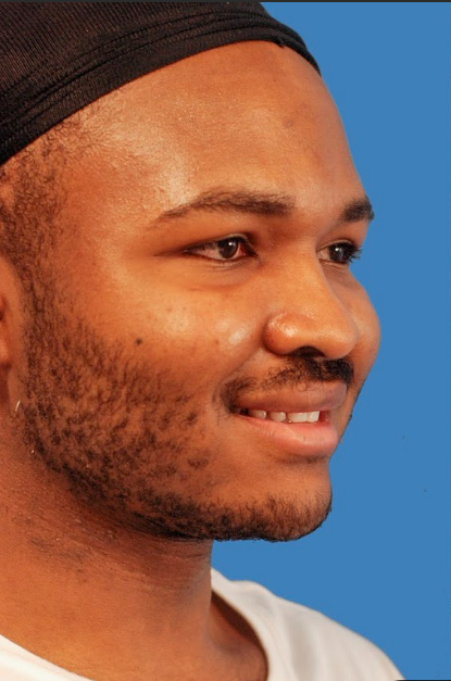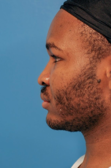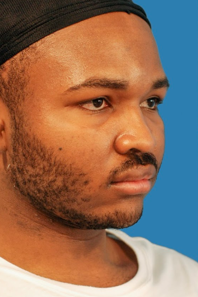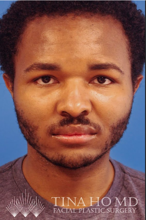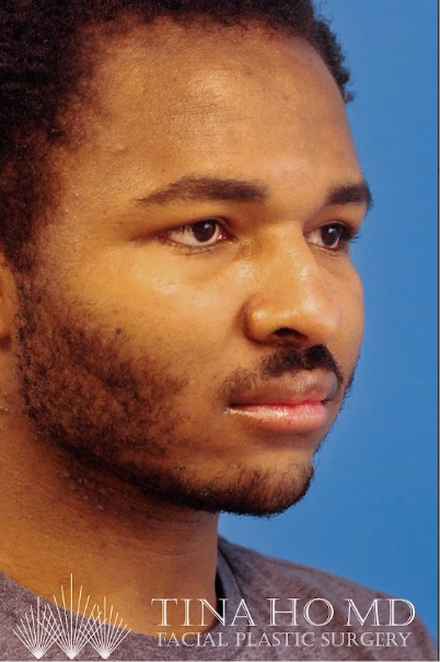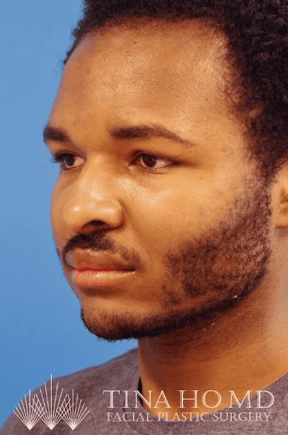 24 year-old male who underwent revision septorhinoplasty with rib cartilage graft and alar base reduction for dorsal augmentation, enhancement of nasal tip projection and rotation, and decrease of nostril size and flare as well as buccal fat removal for facial contouring