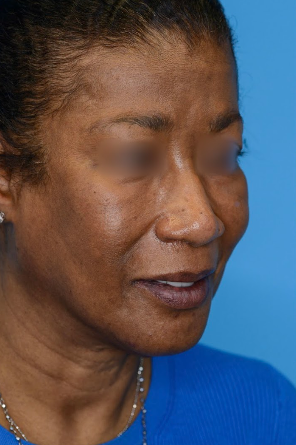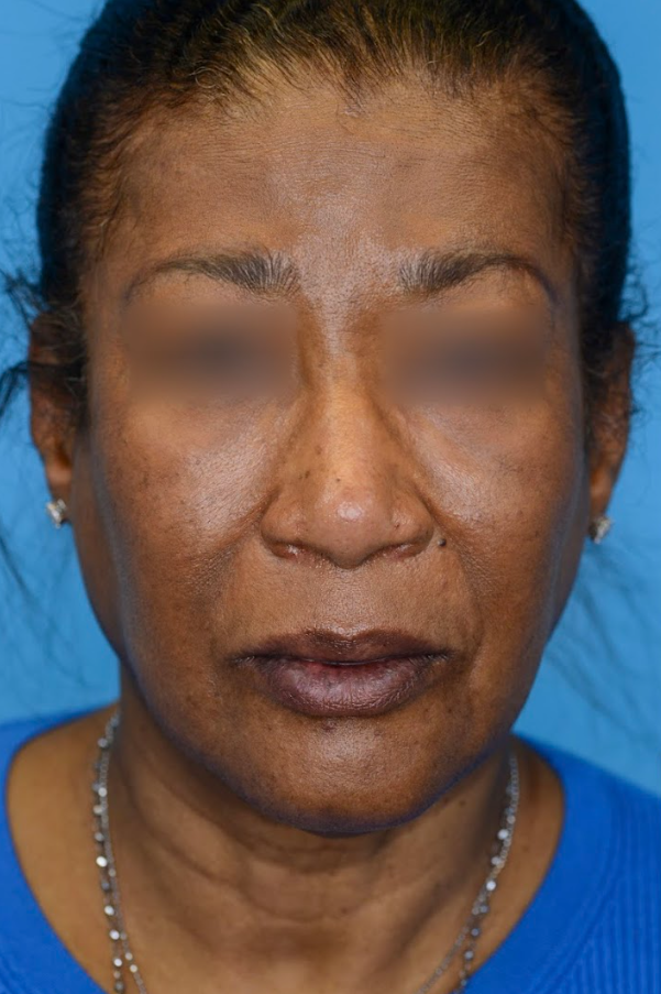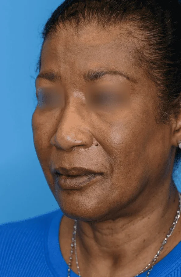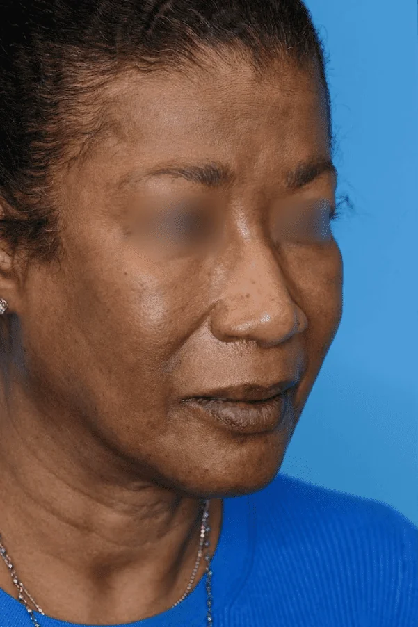 65 year-old female with concerns of bulbous tip and wide, flared nostrils who underwent brow lift and primary open rhinoplasty with alar base reduction for tip refinement and nostril reduction.
