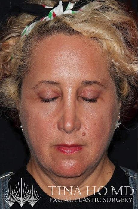 50 year-old female who underwent brow lift, upper blepharoplasty, lower blepharoplasty, facial fat transfer, and CO2 laser resurfacing for eyelid rejuvenation
