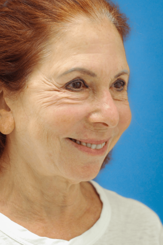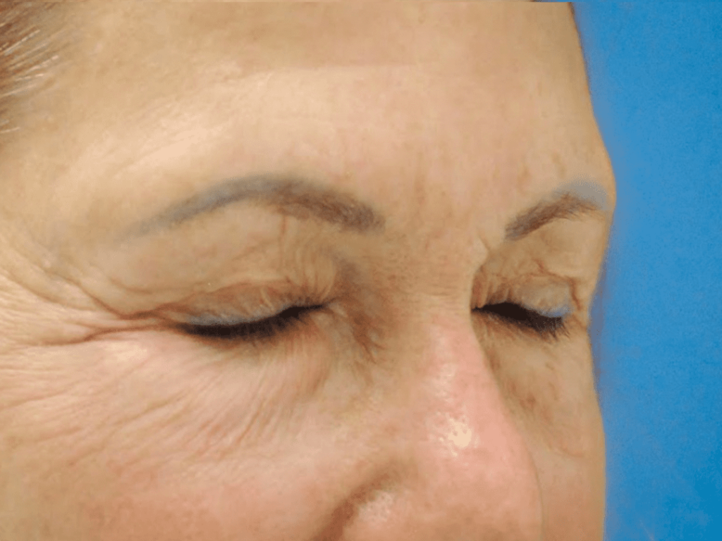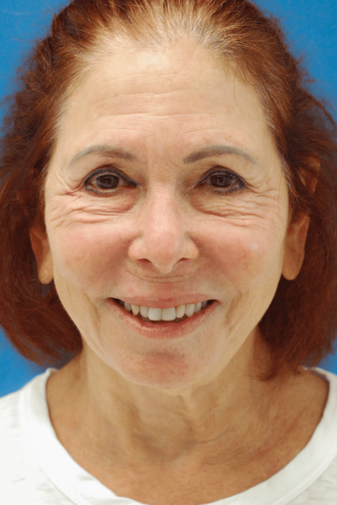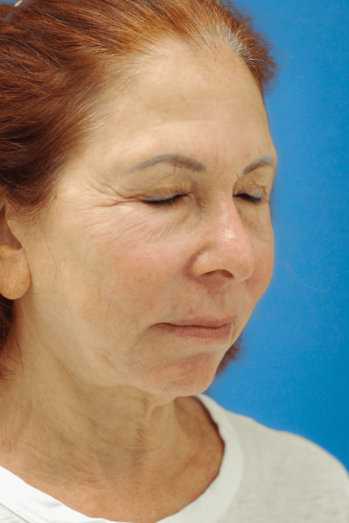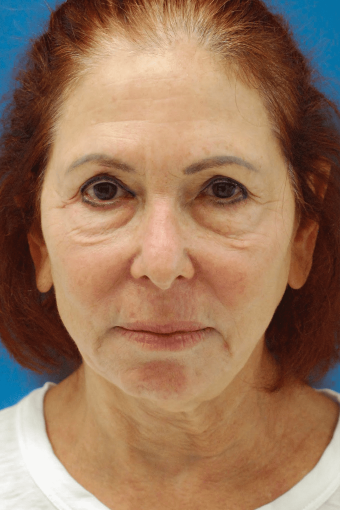 70 year-old female with heavy brows and aging eyelids who underwent brow lift, upper blepharoplasty and lower blepharoplasty with facial fat transfer and CO2 laser resurfacing for eyelid rejuvenation