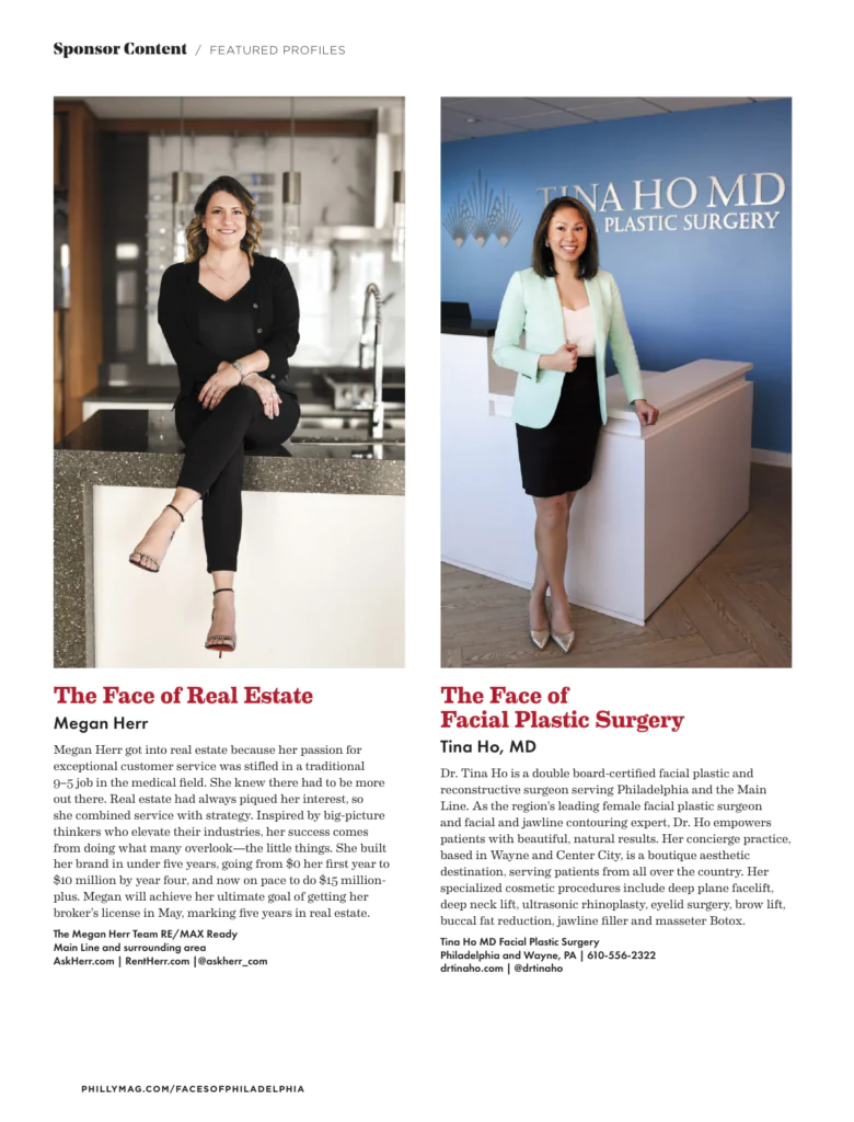 Philadelphia fellowship-trained facial plastic surgeon Dr. Tina Ho is known for refined facial and jawline contouring and finesse facial rejuvenation outcomes. A repeat LOVE Award winner and Philadelphia Style Best of Style honoree, she delivers natural, individualized results.