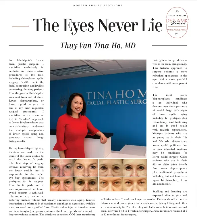 Dr. Ho stands out among her plastic surgeon peers in Philadelphia and Wayne as a double board certified blepharoplasty specialist with dedicated training in upper and lower eyelid surgery, including cosmetic blepharoplasty, revision blepharoplasty, and Asian eyelid surgery. She understands the complex and delicate nature of eyelid surgery as one of the most detail oriented procedures in facial plastic surgery and remains committed to achieving the most natural and rejuvenated results for her patients. Dr. Ho stays up to date on the latest blepharoplasty techniques to ensure precise, safe, and lasting outcomes. From the first consultation to the day of surgery and through every follow up visit, Dr. Tina Ho maintains an unwavering commitment to each blepharoplasty patient to maximize the success of their surgical result. She devotes the necessary time and attention every step of the way to make sure each patient feels comfortable and confident in their individualized surgical plan. Dr. Ho understands that the eyes are the focal point of facial expression and takes to heart the trust each patient places in her care. She specializes in blepharoplasty procedures that restore a refreshed, youthful look while preserving the natural character of the eyes. Dr. Ho is known by her patients as one of the best blepharoplasty surgeons in Philadelphia.