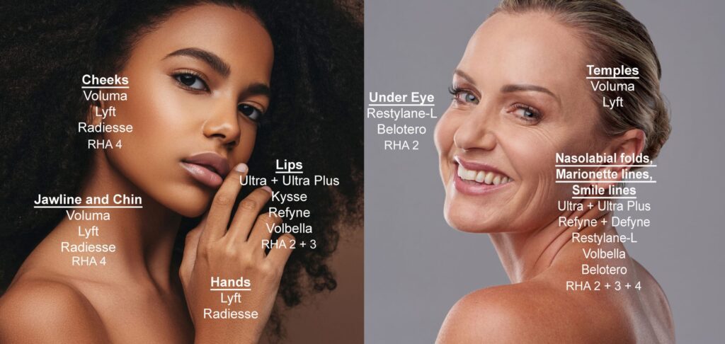 This diagram shows filler products commonly used by Dr. Ho by treatment area. Filler product choice will vary by patient based on facial anatomy, treatment goals, and budget.Dr. Tina Ho has extensive injectable experience and helps patients choose the perfect dermal filler for them based on their facial anatomy and treatment goals.