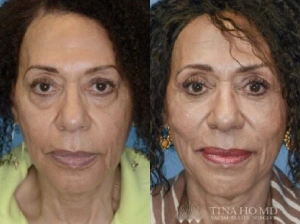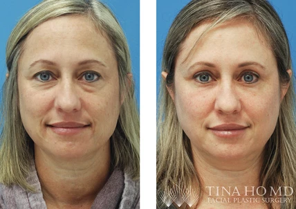 45 year-old female who underwent upper blepharoplasty, lower blepharoplasty, facial fat transfer, and CO2 laser resurfacing for eyelid rejuvenation to address her heavy upper eyelids and lower eyelid bags
