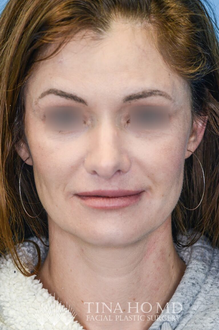 44 year-old female who underwent brow lift and modified upper lip lift including corner lip lift with lip filler injection for brow rejuvenation and lip rejuvenation.
